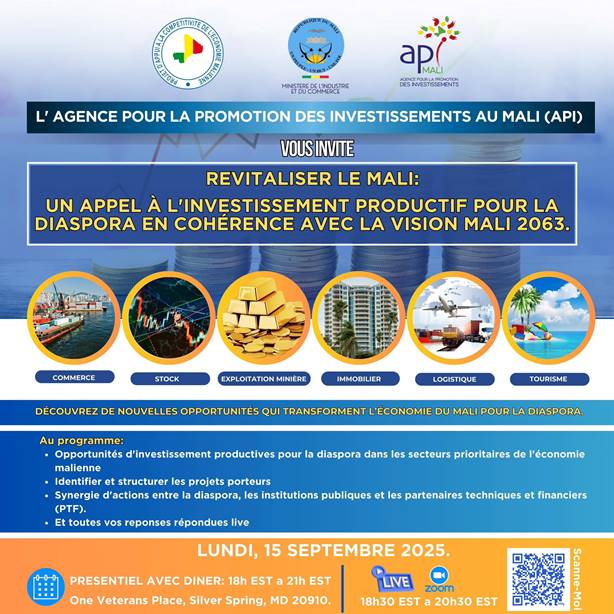 Présenter les opportunités d’investissement et mobiliser les Maliens de l’extérieur autour du développement économique de notre pays ! Tel était l’objectif d’une mission de l’Agence pour la promotion des investissements (API-Mali) aux États-Unis. Elle était conduite par le Directeur général de l’agence, Ibrahim Ahamadou Touré. Cette délégation a rencontré les Maliens de Washington, la capitale fédérale américaine, le 15 septembre 2025. Elle a présenté à cette communauté malienne les multiples potentialités économiques du pays et les opportunités d’investissement dans des secteurs stratégiques tels que l’agriculture, les infrastructures, les énergies renouvelables ou encore l’innovation.